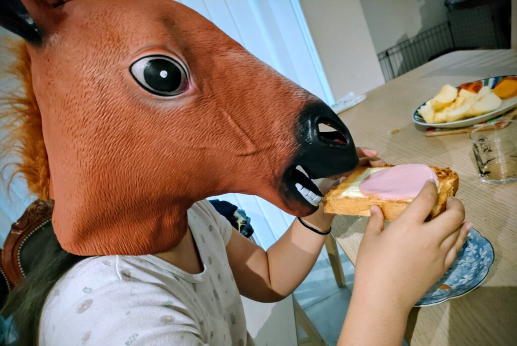 ちなみに我が家の娘(小4)も、ハロウィンの朝、こんな姿で朝食を召し上がっておりました。